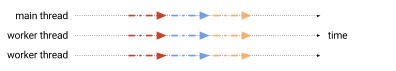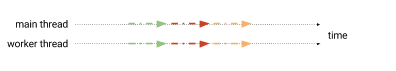 We experimented with a parallel Mark-Evacuate algorithm based on the V8’s full Mark-Sweep-Compact collector. The main advantage is leveraging the already existing garbage collection infrastructure from the full Mark-Sweep-Compact collector. The algorithm consists of three phases: marking, copying, and updating pointers, as shown in Figure 3. To avoid sweeping pages in the young generation to maintain free lists, the young generation is still maintained using a semispace that is always kept compact by copying live objects into to-space during garbage collection. The young generation is initially marked in parallel. After marking, live objects are copied in parallel to their corresponding spaces. Work is distributed based on logical pages. Threads participating in copying keep their own local allocation buffers (LABs) which are merged upon finishing copying. After copying, the same parallelization scheme is applied for updating inter-object pointers. These three phases are performed in lockstep, i.e., while the phases themselves are performed in parallel, threads have to synchronize before continuing to the next phase.