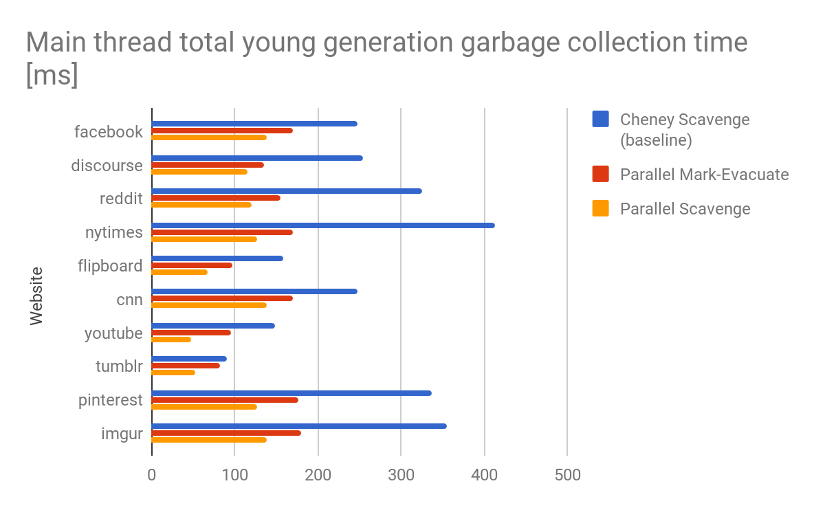 V8 now ships with the parallel Scavenger which reduces the main thread young generation garbage collection total time by about 20%–50% across a large set of benchmarks (details on our perf waterfalls). Figure 5 shows a comparison of the implementations across various real-world websites, showing improvements around 55% (2×). Similar improvements can be observed on maximum and average pause time while maintaining minimum pause time. The parallel Mark-Evacuate collector scheme still has potential for optimization. Stay tuned if you want to find out what happens next.