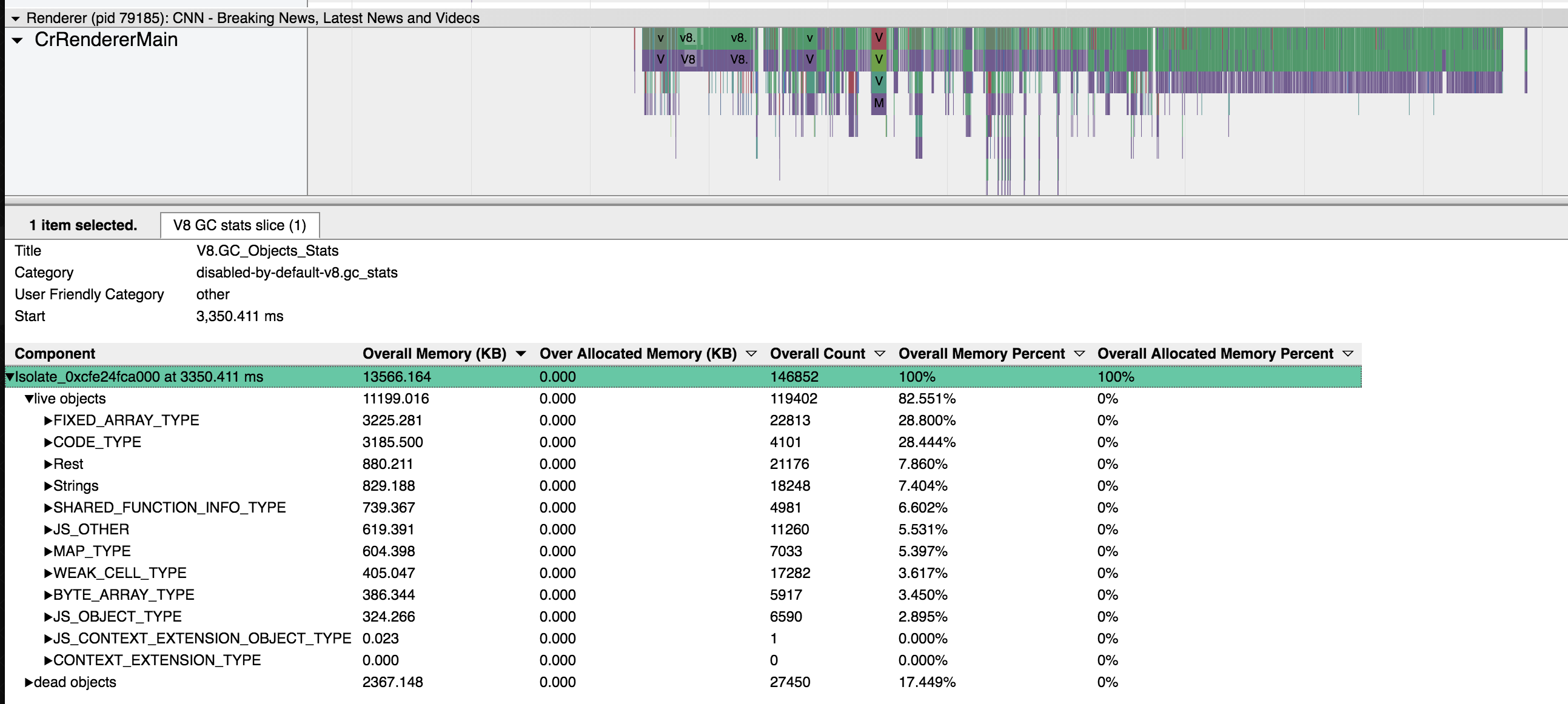 To get Runtime Call Statistics (RCS), please record the trace with the following two categories enabled: v8 and disabled-by-default-v8.runtime_stats. Each top-level V8 trace event contains the runtime statistics for the period of that event. By selecting any of those events in trace-viewer, the runtime stats table are displayed in the lower panel. Selecting multiple events create a merged view.